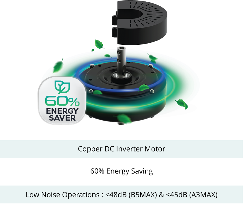 Fans with DC (direct current) motors are more energy-efficient compared to fans with AC (alternating current) motor, typically consuming 60% less power than a standard AC motor fan. JOVEN Ceiling Fans all comes in DC Inverter Energy Saving Motors and low noise at the same time.
